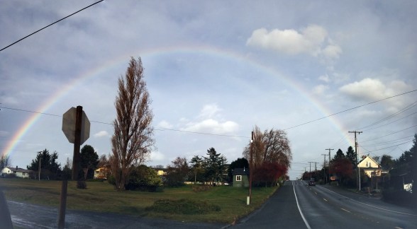 This is for Photrablogger’s Mundane Monday #37. It has been raining cats and dogs a lot in Western Washington and I was headed out to my car from work. This was the view up the street, two shots combined…..