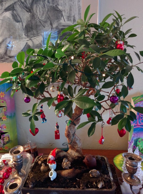 My father cared for the remaining ones even as his health deteriorated. He died at home as he would have wished, in 2013, alone and a sudden death. Two of the three remaining trees died. So this ficus came home with me. I water it faithfully and brought out the small ornaments to decorate for the holidays. I don’t know how old it is. After we lose our parents, we wonder about things: where is this from, how old is it, was it important to you, was it a random gift? Did you buy it, did you love it, was it not something that you cared about?
