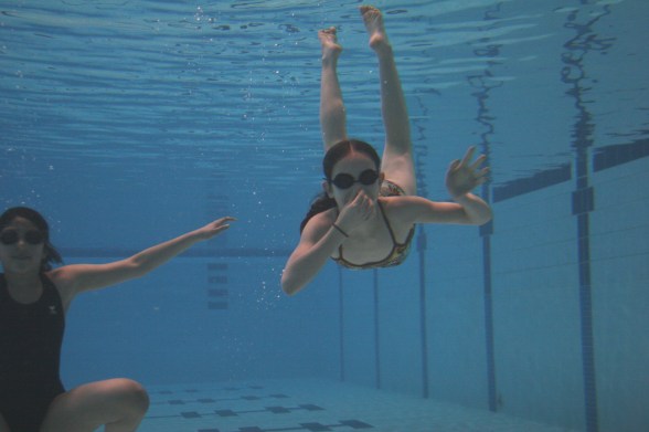 I did not take this photo: it was taken at the Weyerhaeuser Pool in Seattle in 2009 at the National Junior Synchronized Swimming Competition. The professional photographer asked our girls to jump in so that he could get some practice shots from the underwater window. No one else was allowed down to that window. My daughter was in her third year of synchro and already so comfortable in the water that she and the others just mugged and played….