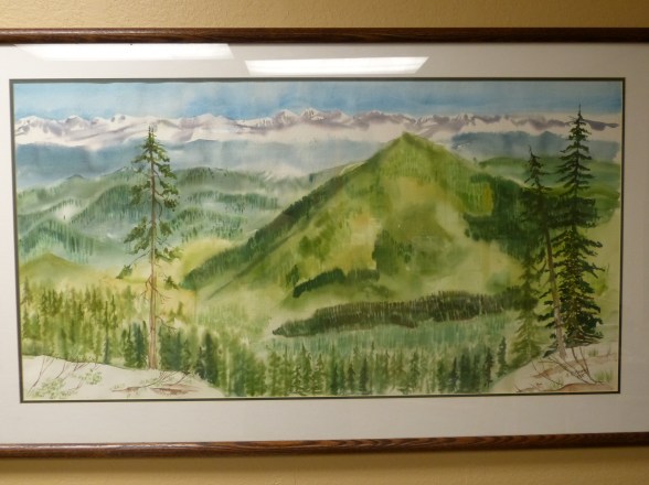 I have been changing the art in my clinic with the seasons. This is by my mother, Helen Burling Ottaway, and is currently up in the clinic. This is her largest watercolor, of the Olympic Mountains, painted in the last few years of her life.