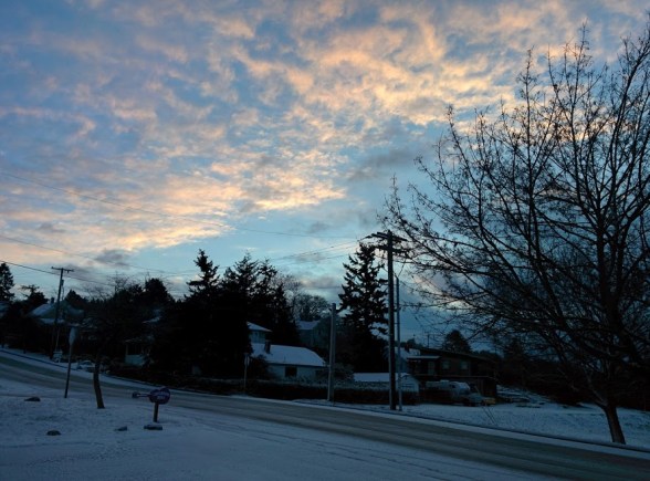 Monday morning. We still have snow here and have had flurries daily. Unusual for here. Sometimes we just get snow that melts as the weather warms during the day.