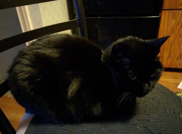 Here is Boa, in my kitchen, black with blue highlights. She used to sit in front of the vents when the 1979 propane furnace worked. Now I have a heat pump, high on the wall in the kitchen. The closest she can sit is up on the two chairs that tuck in the end of the counter. She is 12 years old and less interested in going outside this cold winter. She misses the kids and the other cat, who was hit by a car three years ago. She likes it when the kids come home, and when they leave again, she is a little bit blue…..