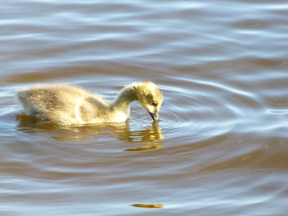 Most of the goslings were snuggled in the grass near the shore, with the parents guarding on land and in the water. A few ventured just a little into the water….is this their first swim?