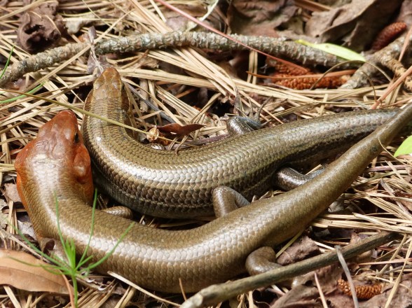 This photograph is also from my hike two days ago. These are broadhead skinks, I am told. Skinks are lizards and their family has 1500+ species. This pair was right by the hiking trail. I tried not to spook them and succeeded. They were still curled there when we walked on.