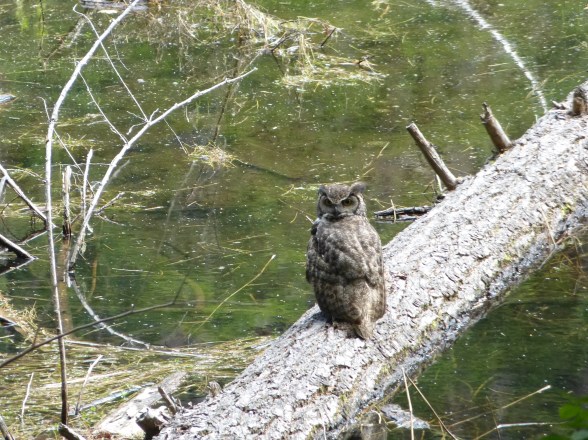 We parked in the lower parking lot for Mount Townsend, which means an extra 1.2 miles each way. But, we pass the small lake. On our way down in the afternoon we spotted this beauty. A great horned owl: sunning? Fishing? Enjoying warmth?