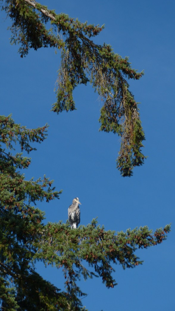 This is the second to last post in this series. I zoom back out some to capture the scale of this tree, our great blue heron, how she is so comfortable sitting on this branch so high up. Where I would not be comfortable at all. She amazes me.