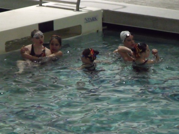 This is from the PNA Invitational, synchronized swimming, 2011, our girls after warm up. Their break is in the water, comfortable there….
