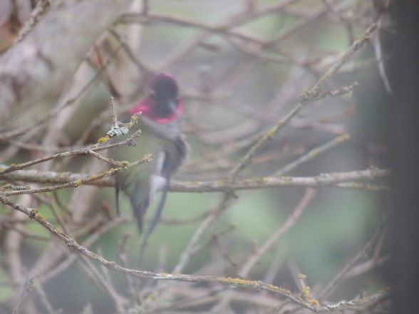 This is NOT a brilliant photograph, but I am putting it up anyhow. This is Tictoc, one of the two regulars that come to the hummingbird feeder outside my window and a new part of our family. Tictoc is grooming in this shot. I still have not figured out what species of hummingbird, nor whether male or female, though we’re over gender anyhow, right?