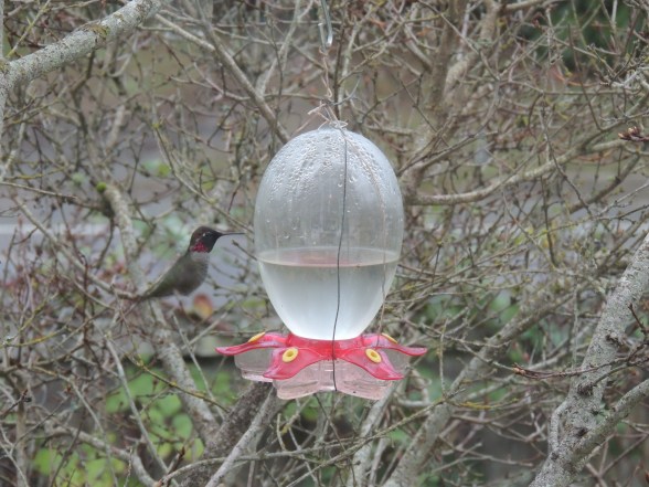 Here is a fabulous use for a bottle, to feed Tictoc and our other hummingbirds. We read and found that the Anna’s hummingbird winters in our area, so she is an Anna’s and we are not messing up migration.