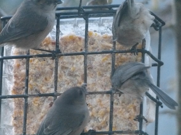 Out my kitchen window. For weeks I saw this food disappear, but no birds. It is around the corner from the hummingbird feeder. I think the hummingbirds guard the area.