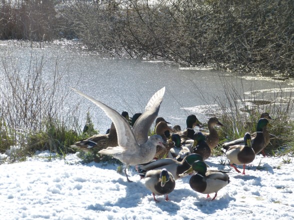 We went down early and took pictures in the snow. Kai Tai Lagoon was partly frozen. How many different birds do you recognize in our assay?