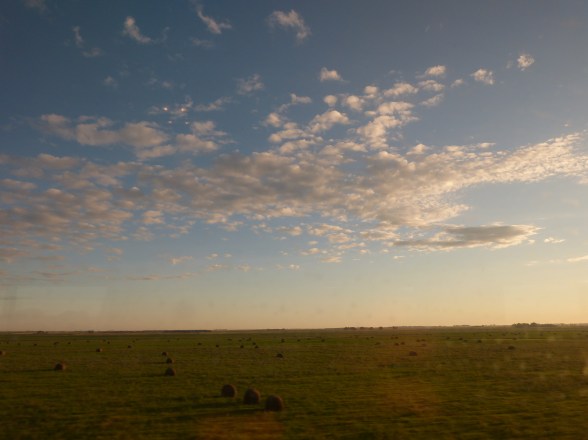 More from my 2014 train trip. I love the long shadows of the hay bales. The other shadows are subtle: reflections in the window of the train….