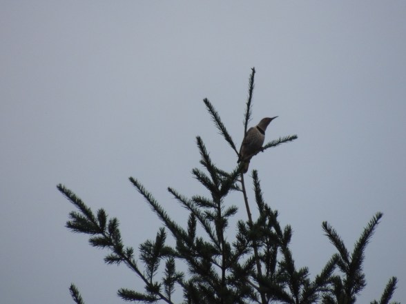 I yearn to get more exercise. Sort of. I’m not making it enough of a priority. I did walk to work about a week ago and lots of trees were topped with birds. First a yellow shafted Northern Flicker. Am I sure it’s yellow shafted and not red shafted? Well, no. I would need a brighter day to see it’s tail that well.