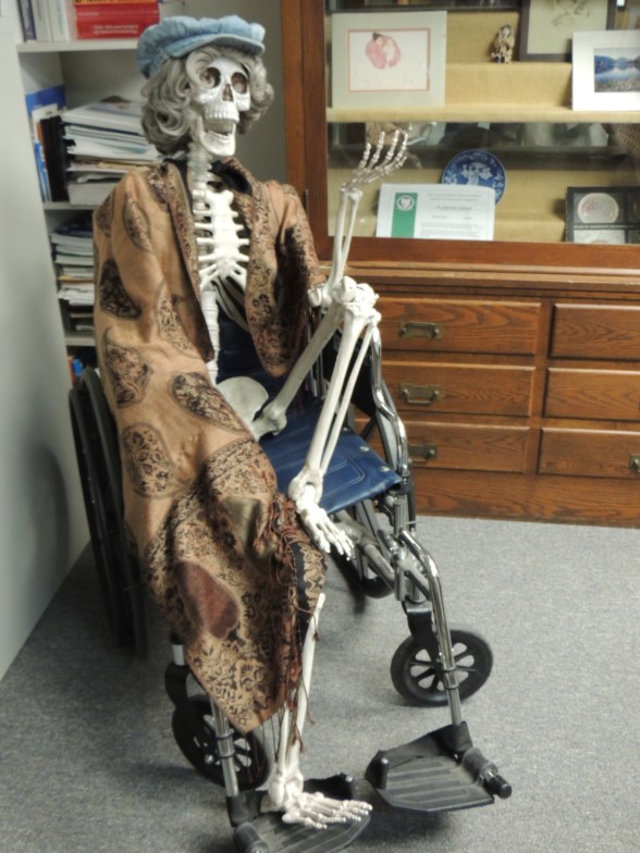 Mordechai, our clinic skeleton, had such a wonderful time out at dinner last month. As you can see, she is still conversing about it. We’ll have to take her out more.