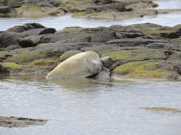 On Hawaii we went to a park and saw green turtles. They are born about 1000 miles away on a different island. They travel in the sea and now come to Hawaii to rest. The ones who rest on the beaches are 20 to 140 pounds. As mature adults, they will be 200 to 400 pounds and live back in the sea.