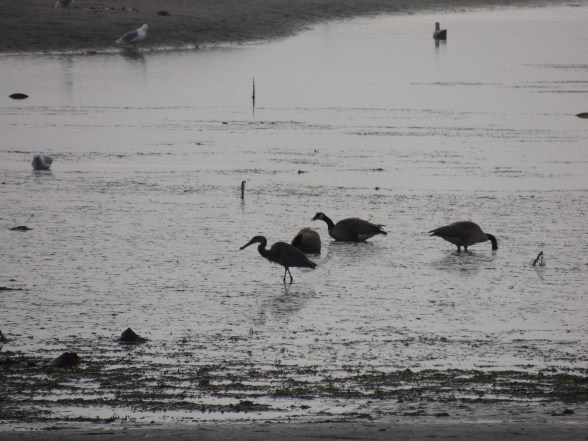 This is taken with the zoom all the way out. I recognized the great blue heron, but in the first picture I can’t tell what the geese are. With a face in profile in this second photograph it’s clear that they are Canada geese.