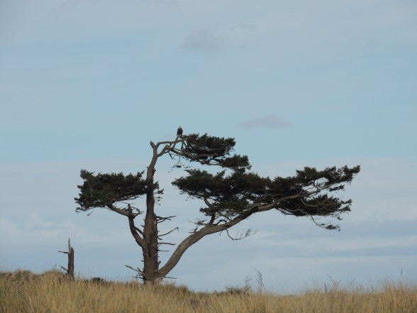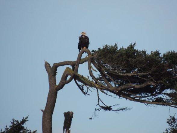 My daughter and I walked the beach on Saturday and I spotted this eagle. We walked towards the lighthouse and so were essentially circling this tree slowly and from a distance. Photos of the eagle from many angles. It was a beautiful day!