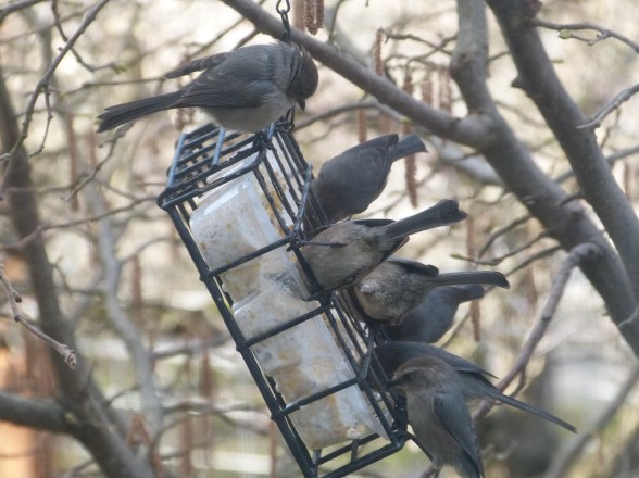Every so often I get the flock at my feeder. I did this morning. I think these are bushtits.