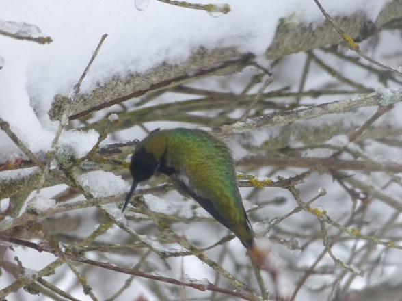 No snow now, but the Anna’s hummingbirds were guarding the feeder most of the time when it was cold, especially when I would thaw it. One especially cold hungry day, it dive bombed me when I went to wrap a warm towel around the feeder to warm it up. Fierce little birds!