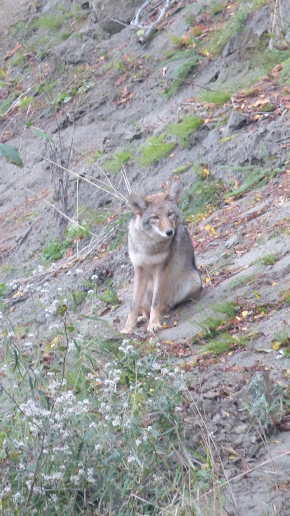 When we turn around, there is Coyote. She has shadowed us down the beach, and she slips into the brush at the foot of the cliff. She is quickly not visible.