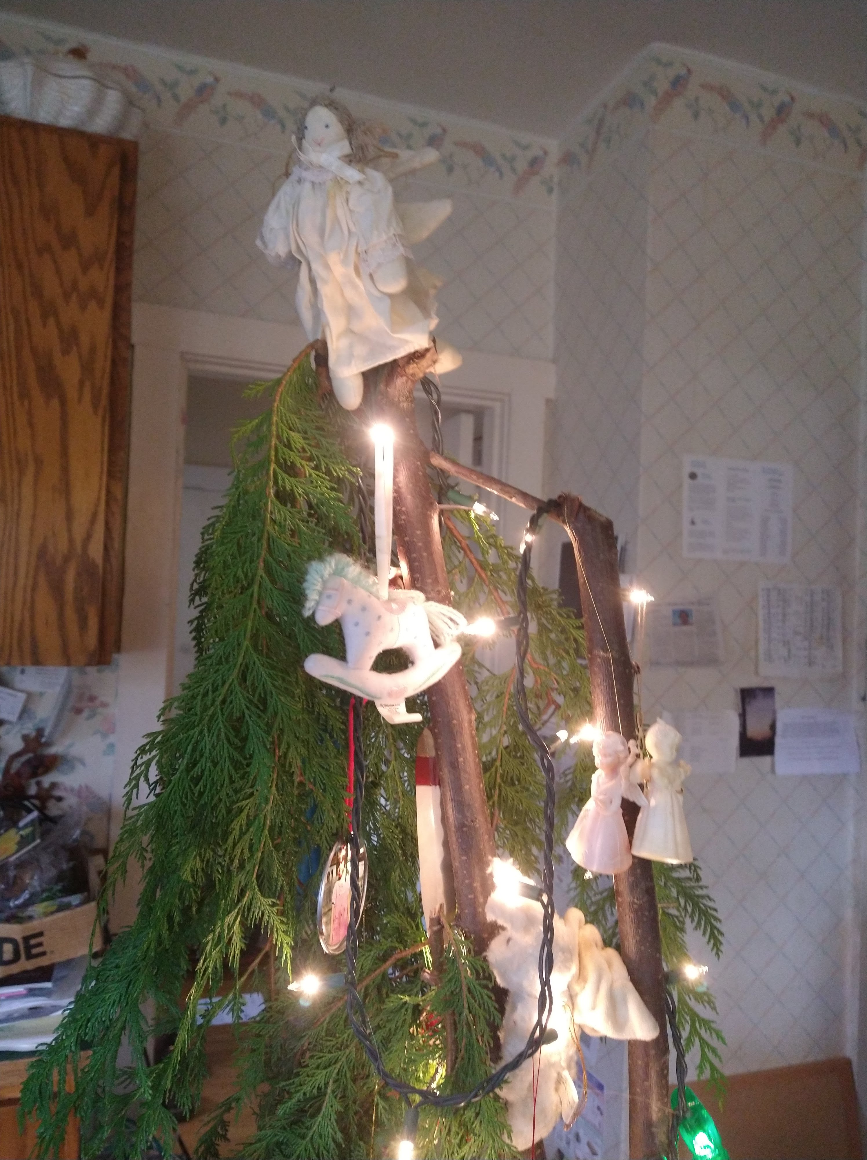 Well, the stick with lights was ok when it got knocked over by young curious cats Elwha and Sol Duc. And I added four branches, but not a whole tree. I was traveling anyhow, so I did not want a formerly live tree.