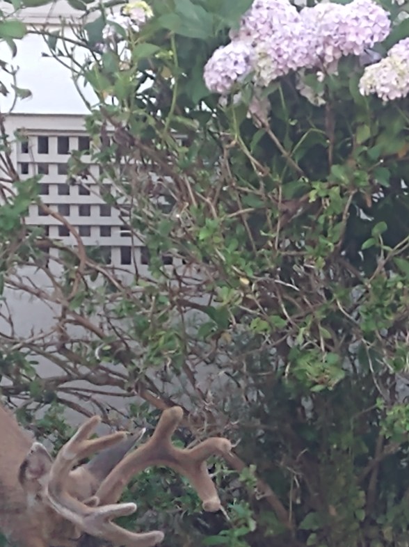 The buck was right across the street on Tuesday, right before our dress rehearsal. I parked there and got out before I saw him. He didn’t mind. He continued to eat the hydrangeas. Yum.