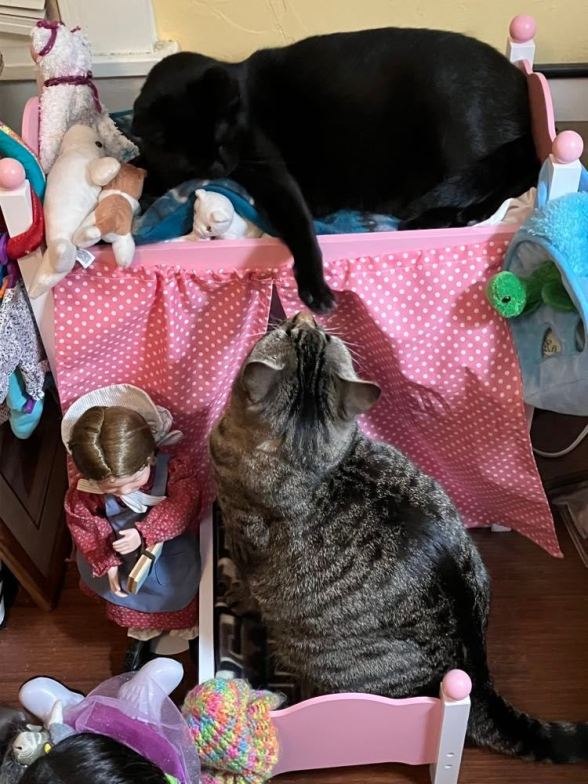 The photograph is Sol Duc and Elwha enjoying doll bunkbeds. And acting like siblings do sometimes. And then they curl up together.