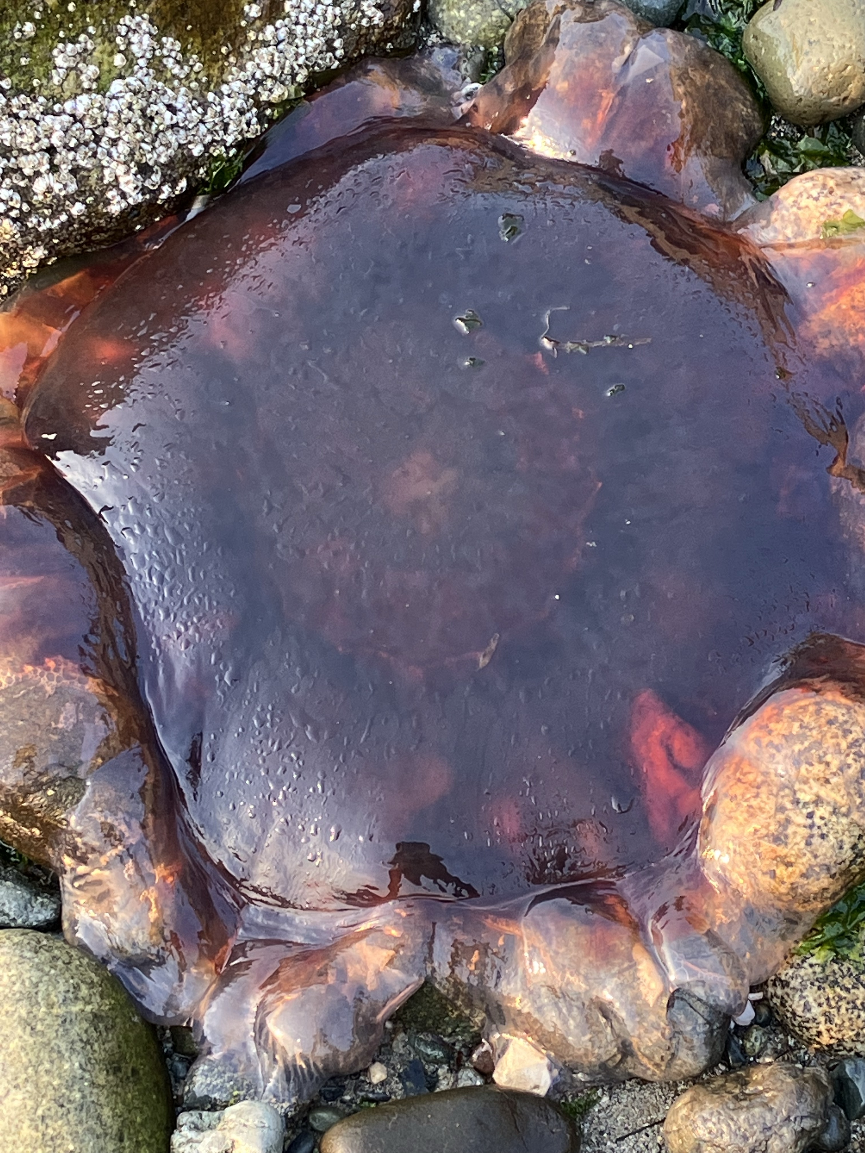 You are walking on East Beach, Marrowstone Island. It is sunny. The tide is way out, with fields of bright green slippery algae. You stay on the rocks. Some of them are slippery too. There are crows and an eagle, on the beach, feeding. There is a great blue heron. You can see sea lions out on the rocks, though your camera battery has died, again.