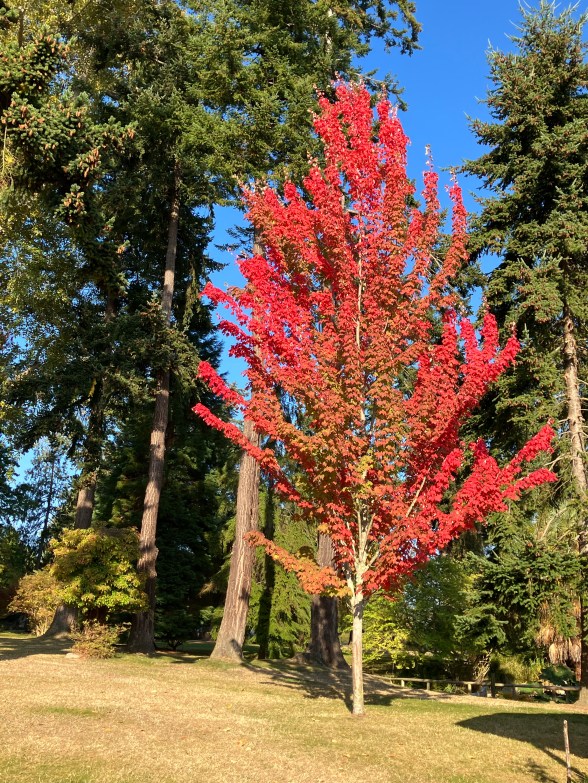 Our native maples are Big Leaf Maple and Vine Maples. There are Red Maples all over town now and they are exquisite and spectacular. Rain is supposed to start this Friday and since we still have bad air quality from the fires in Eastern Washington, I think we will all be glad for rain.