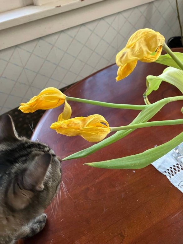 I fill the bird feeder, a day late, because I had to go buy more birdseed. I also buy suet and fill that feeder. I walk both cats, harness and leash, one at a time. I put both of them in the outdoor screened animal container and they crouch, riveted watching the birdfeeder. I put four peanuts along the top of the fence.