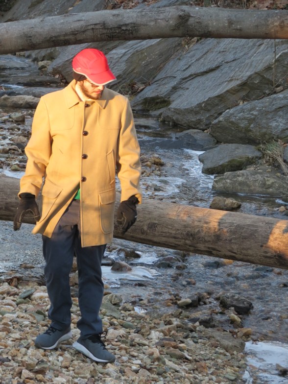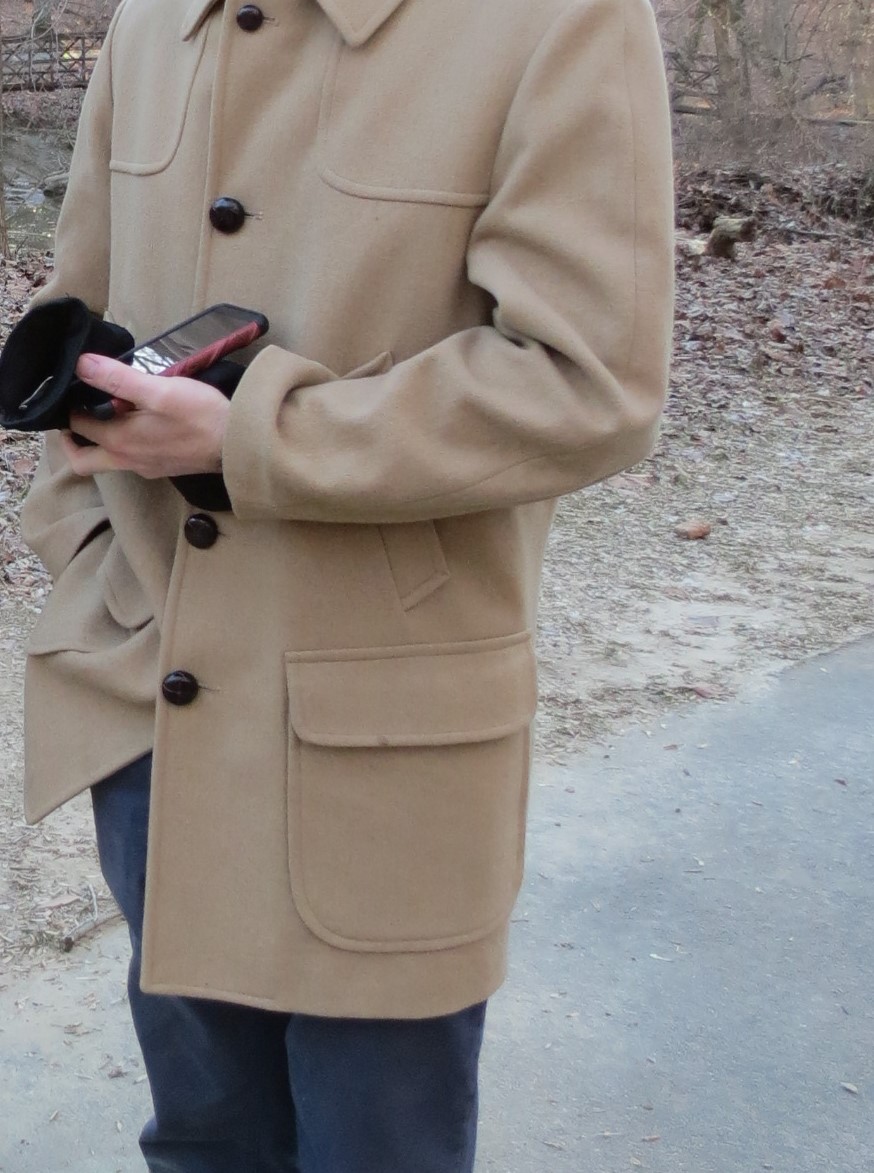 The next day my ex-husband’s father’s second spouse comes to brunch. She is the last of the six grandparents. We have a lovely brunch. She is a potter and a landscape architect and is helping my son and daughter in law with their garden and yard. After brunch we walk back to the creek, keeping our eyes peeled for the button. She has a button collection but not that button. He might find one on the internet. Or he could contact Pendleton, since it is a Pendleton coat. Very handsome.