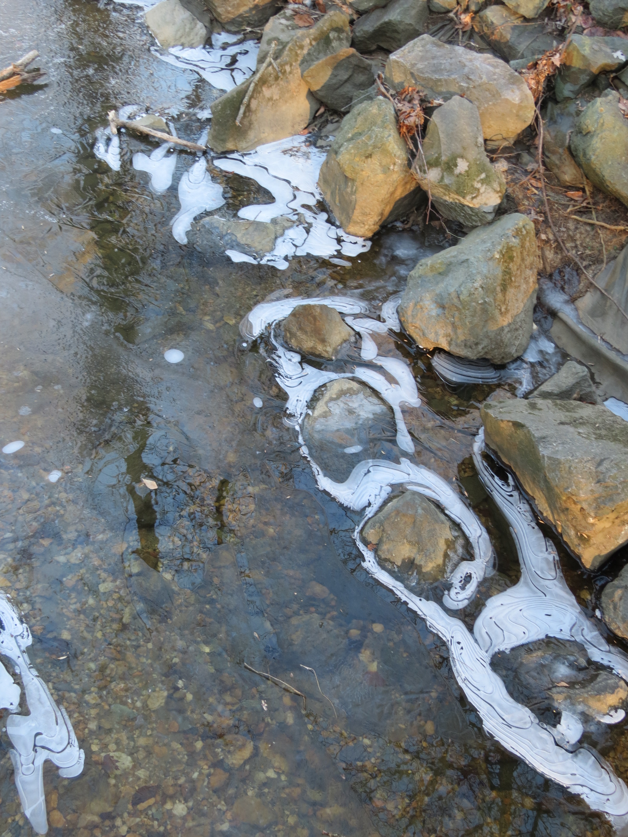 We go for a lovely walk in Rockcreek Park in Maryland. It is very cold and the creek is half frozen. My son goes down to the creek and throws rocks on the ice.