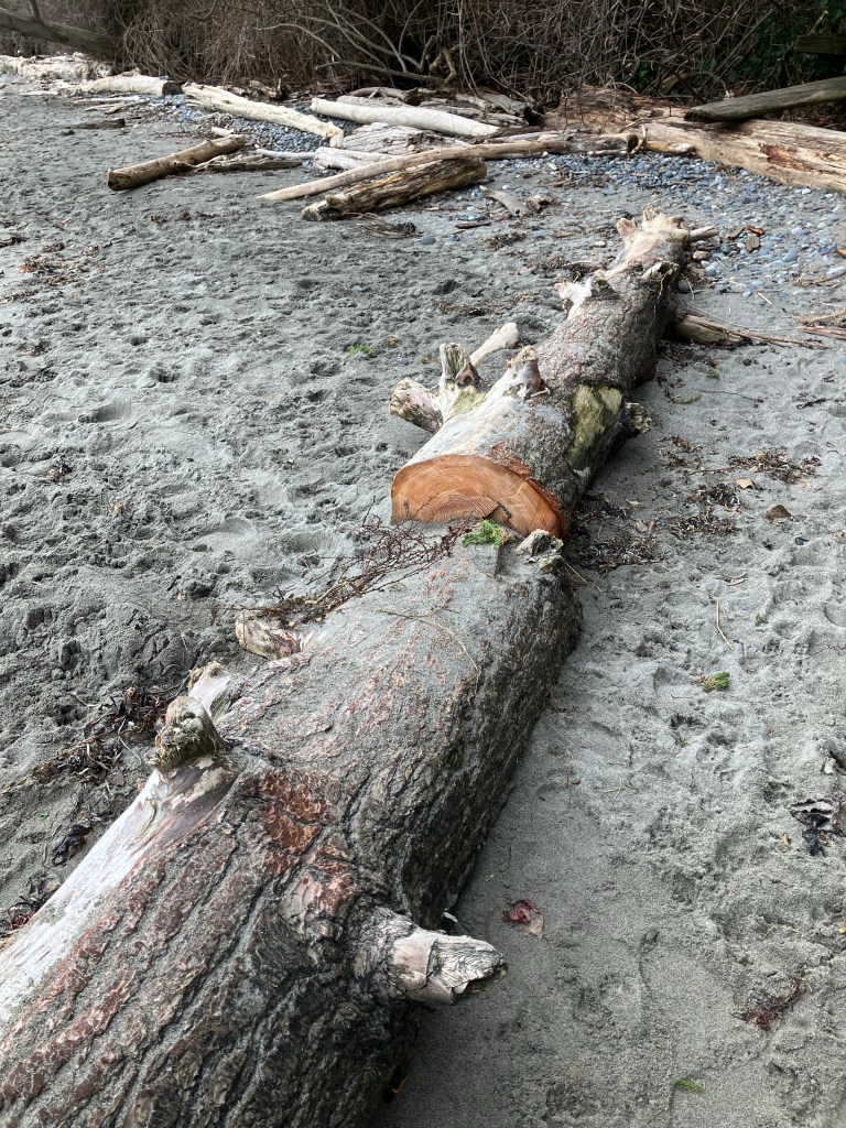 How can I say it is a winner? Someone had sawed through one end. This tree had a long life judging by the number of rings. Now it has fallen and probably gone down a river to land on the beach. It might be there tomorrow or the tide may carry it off again.