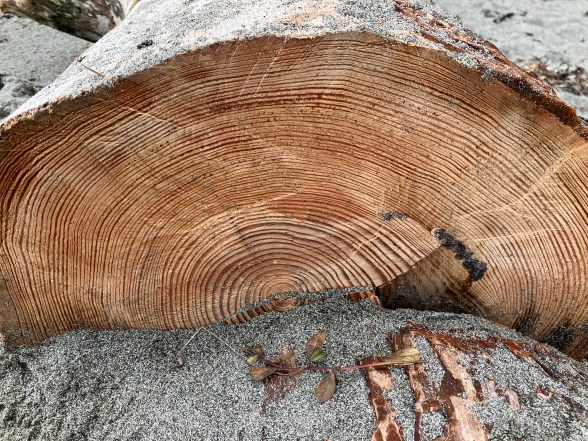 How can I say it is a winner? Someone had sawed through one end. This tree had a long life judging by the number of rings. Now it has fallen and probably gone down a river to land on the beach. It might be there tomorrow or the tide may carry it off again.