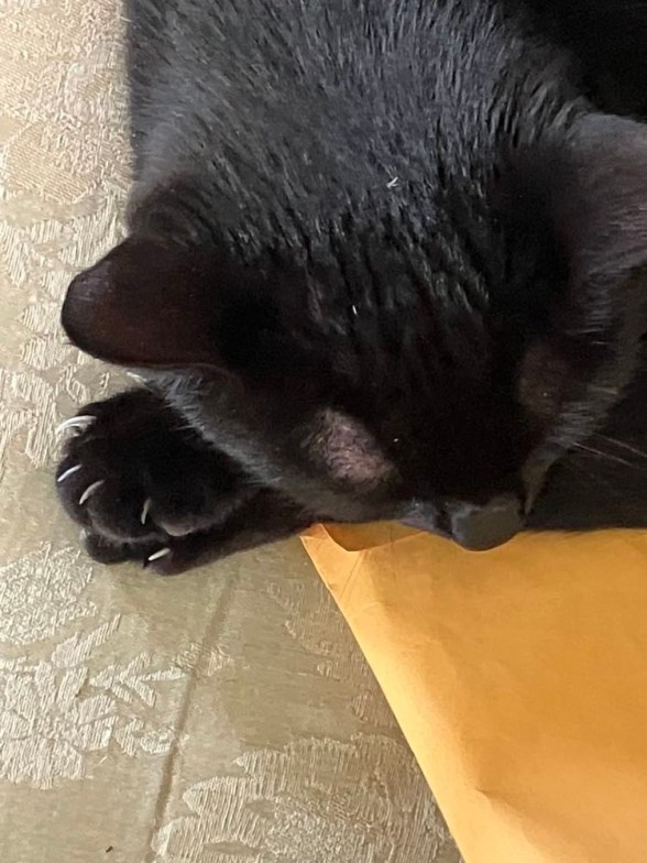 Sol Duc is playing a game alone, capturing her back foot with her front, claws out on both. When she realizes I am watching, she puts her head down and pretends to be asleep. She isn’t asleep, I can tell by the claws and the ear tilt.