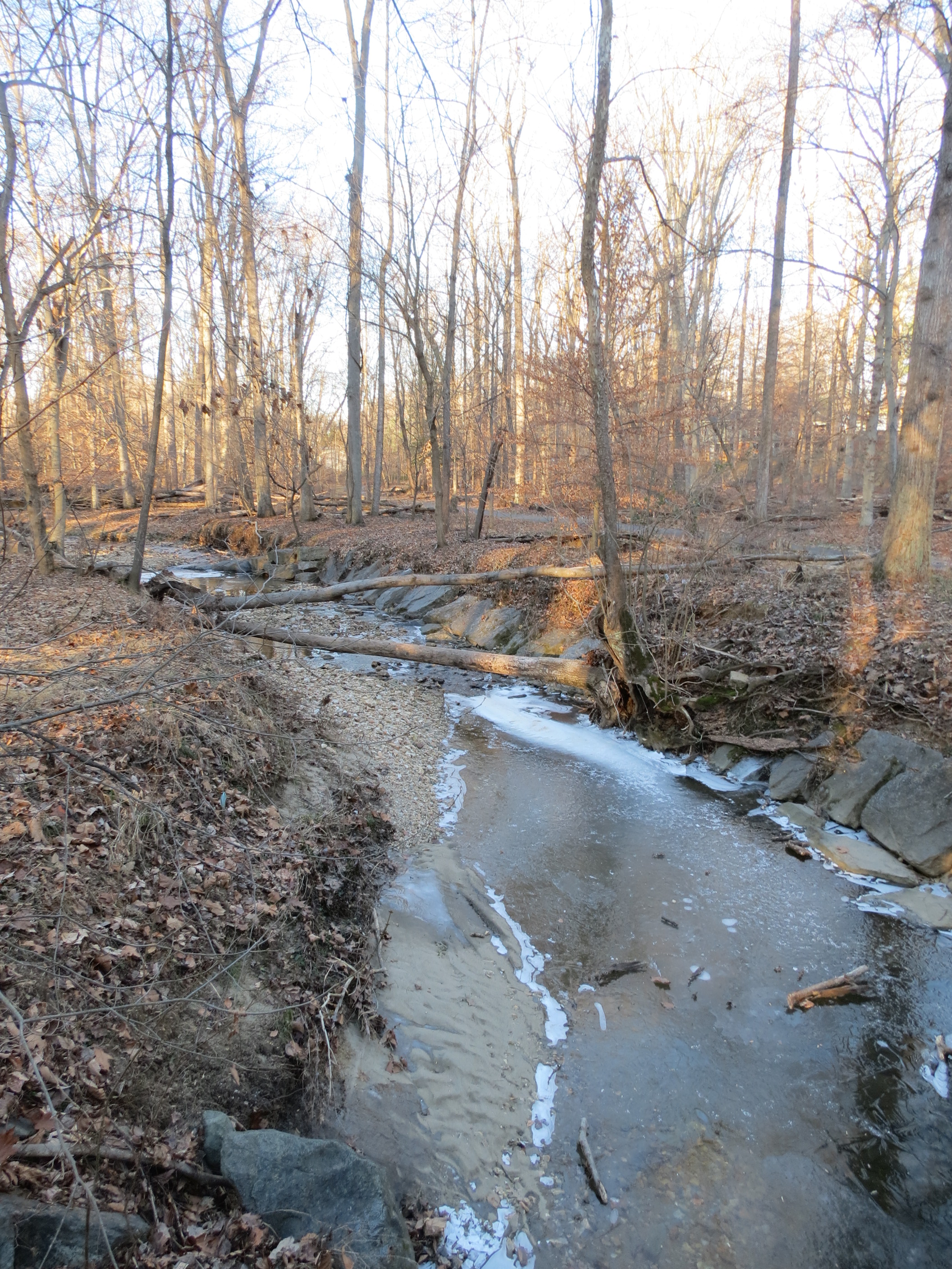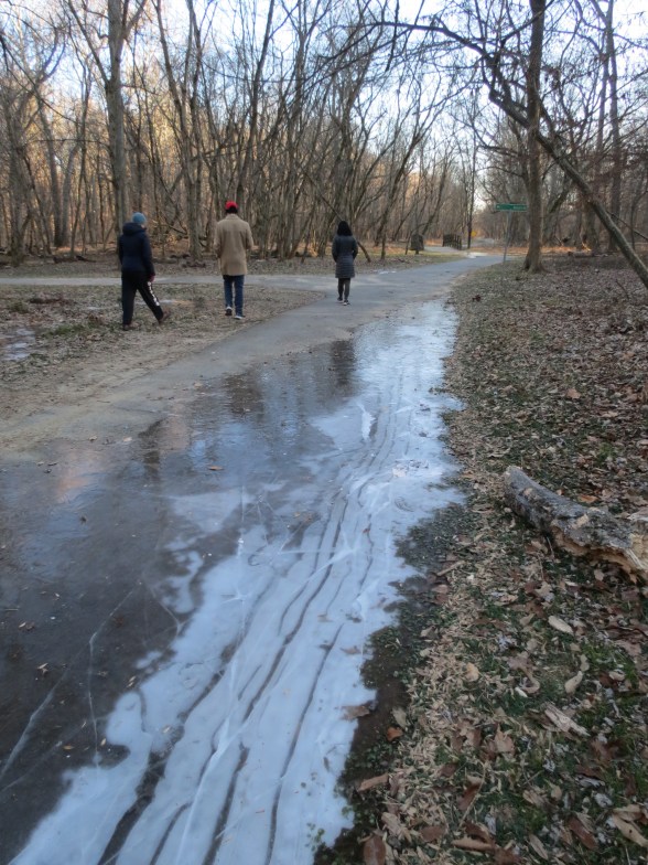 Last winter, I walked Rock Creek Park with my son, daughter-in-law and daughter. There was a quite beautiful stream with wonderful ice patterns. We lost a button and then found it the next day, caught on the ice.