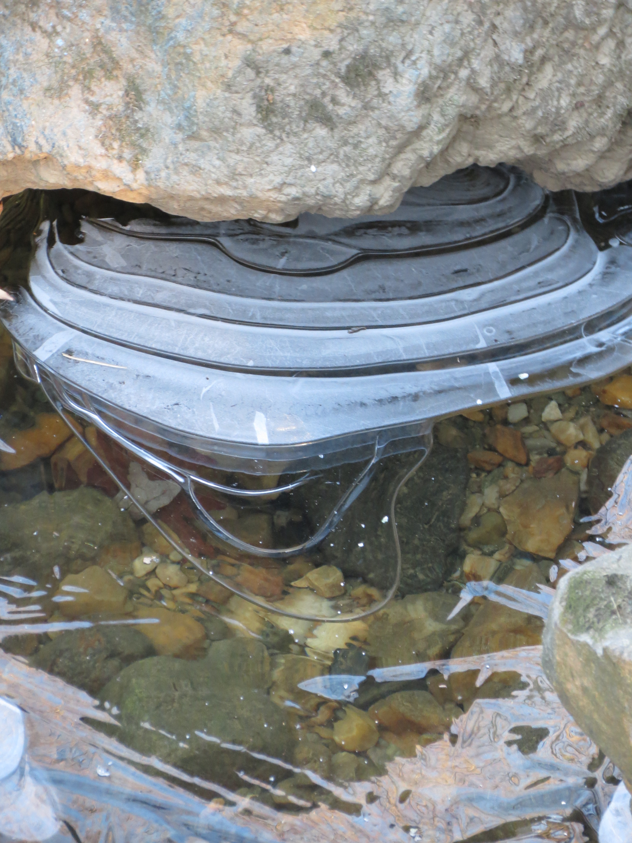 The ice formed beautiful patterns on the creek with the cycle of freezing and melting and air caught under the ice.