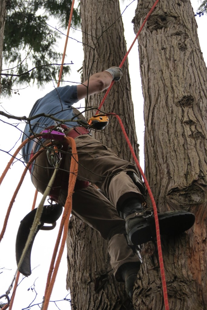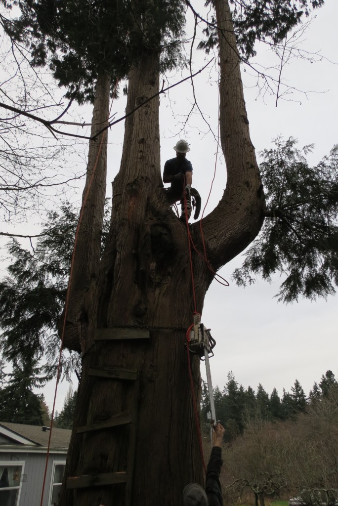 Teamwork taking down four trunks 20 feet up in a cedar, close to a house.