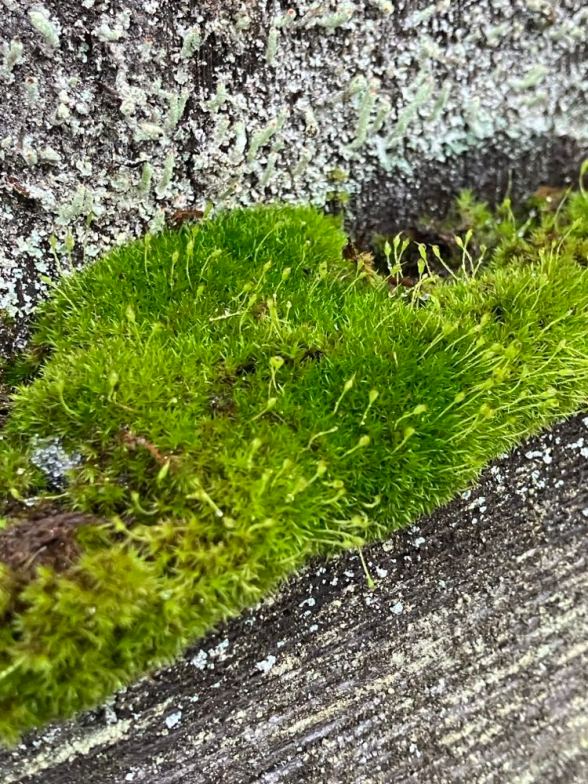 Did this tree get cut early, leaving the base? Or blown down by a wind storm or hit by lightning? It is growing anyhow and is a wonderful home for moss and lichens in the winter. Quite beautiful.