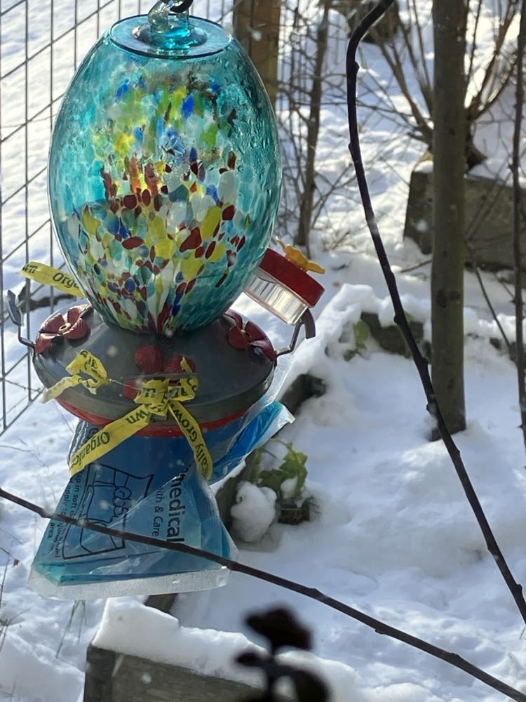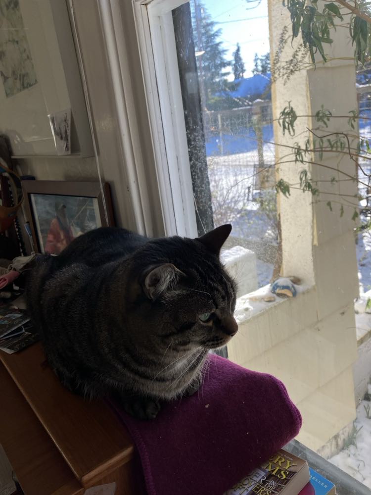 The hummingbirds were very hungry in yesterday’s 17 degree weather. At first Front Anna looked disheveled and fluffed up and miserable, but she cheered up considerably after breakfast. I filled my squirrel chewed bird feeders too. I put a warm scarf on each of my desks in front and we had a nice day of cat tv. My house was built in 1930 and it is not well insulated. Usually it’s not bad, just cooler upstairs, but in this cold it comes through all the walls and windows, storms or not.
