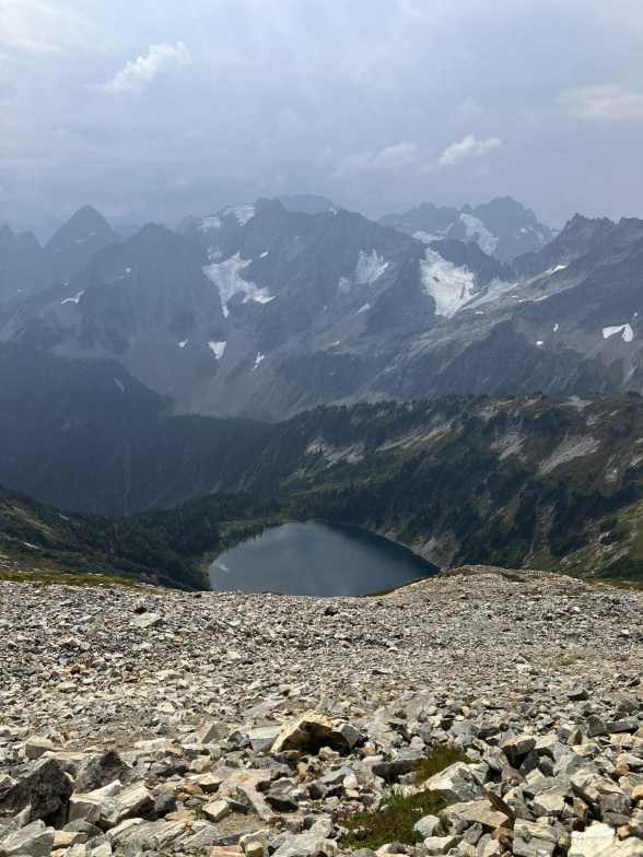 So that is how I was left in the scree to dream. I would have returned by the time it started raining anyhow, and the trail was good once we got past the scree. Not all the way to the lake in the photograph, the trail ran along a ridge that is not in the picture and wound down near the lake.