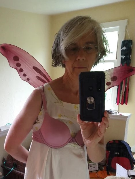 Ok, I have been going through my clothes. I found both the pink bra and the wings in the bottom of a closet. So, I put them on. I did not actually step outside the house wearing this. I think I need a costume party. Anyhow, it’s rather fun trying these silly things on. I’d have to wear the wings over my White Coat to doctor in this outfit…..