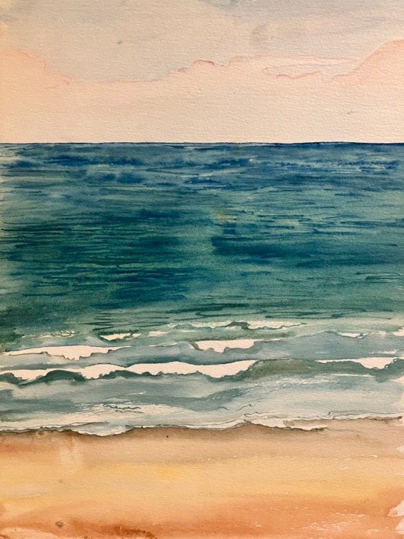 This watercolor by Helen Burling Ottaway does not have a date. I love the whitecaps using the paper. Tricky to do that, I have tried. My daughter also draws horizons and seascapes, over and over. This is 11 by 15. I suspect it is from the late 1970s or early 1980s, because there is a watercolor of my sister on the beach, similar to this. My paternal grandparents lived on Topsail Island in North Carolina and that is the most likely location.