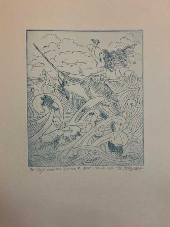 Back to etchings: U is for Unicorn. This is titled “The Virgin and the Unicorn II”, number 10/75, 1986, H. Ottaway. The etching is 7 inches by 8 inches and the paper is 11 inches by 15 inches. She would often frame them mounted but not matted, in frames that have a slot to hold the glass away from the picture. She did her own framing and especially disliked cutting glass. I knew when a show was close because she would be framing and grumpy.