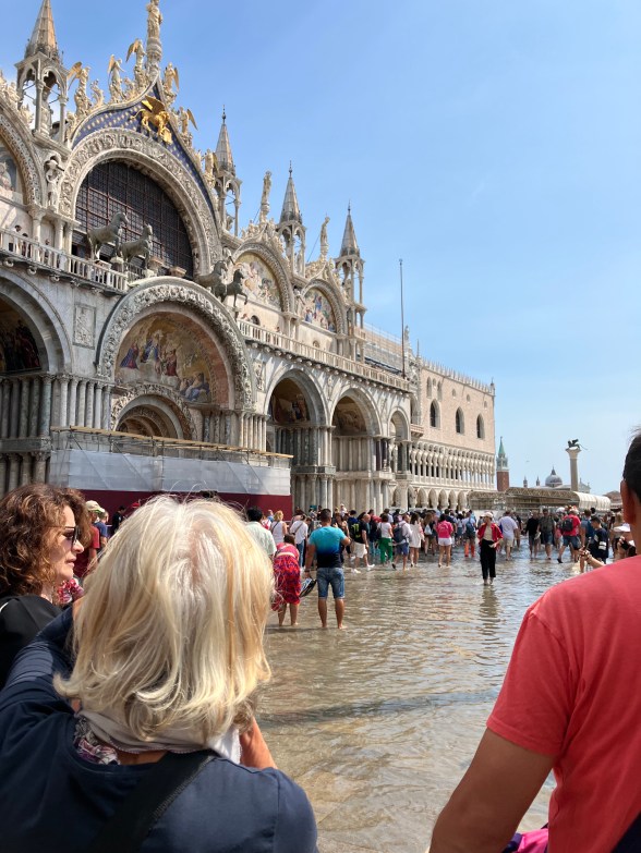 At high tide there was mild turmoil in waiting to see Saint Mark’s Basilica. Either wet shoes, or buy plastic covers, or remove your shoes and socks until you are at the church.