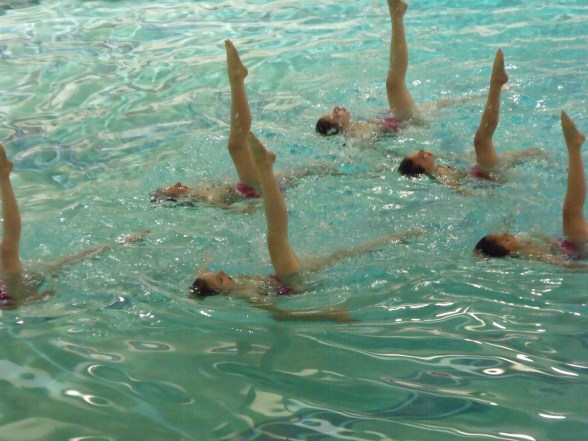 The front part of the pool is empty. The teams of girls are along the edge, warming up, getting ready for competition. There were over thirty teams. Not simple at all.