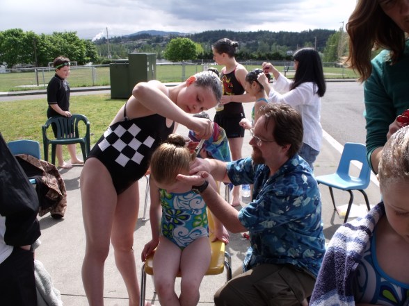This organized chaos is from 2010. I am thinking about parents and kids. Here we were getting ready for our yearly synchronized swim team show. This involves painting the hair to stay in place with thick very warm gelatin. We did that outside. It’s messy.Β  Synchronized swimming might not be mundane to you but we all have times when we get ready or help others get ready.