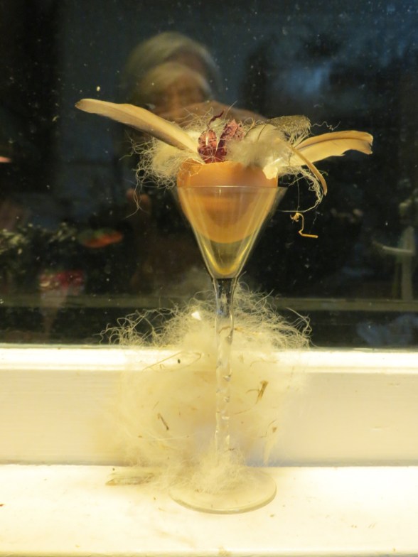 I have been collecting eggshells for a while. I am not sure exactly what I am going to do with them, but this is my first piece of egg art. I keep thinking about the large sugar eggs with the window, with small figures inside, that we got as children. I am saving real eggshells and bits of feather and fluff and pine cones and shells. With Easter tomorrow, I may dye some eggshells.