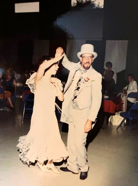 The story is fiction. The photograph is from my wedding, 1989. He’s hamming for the audience again. I do not know who took this!