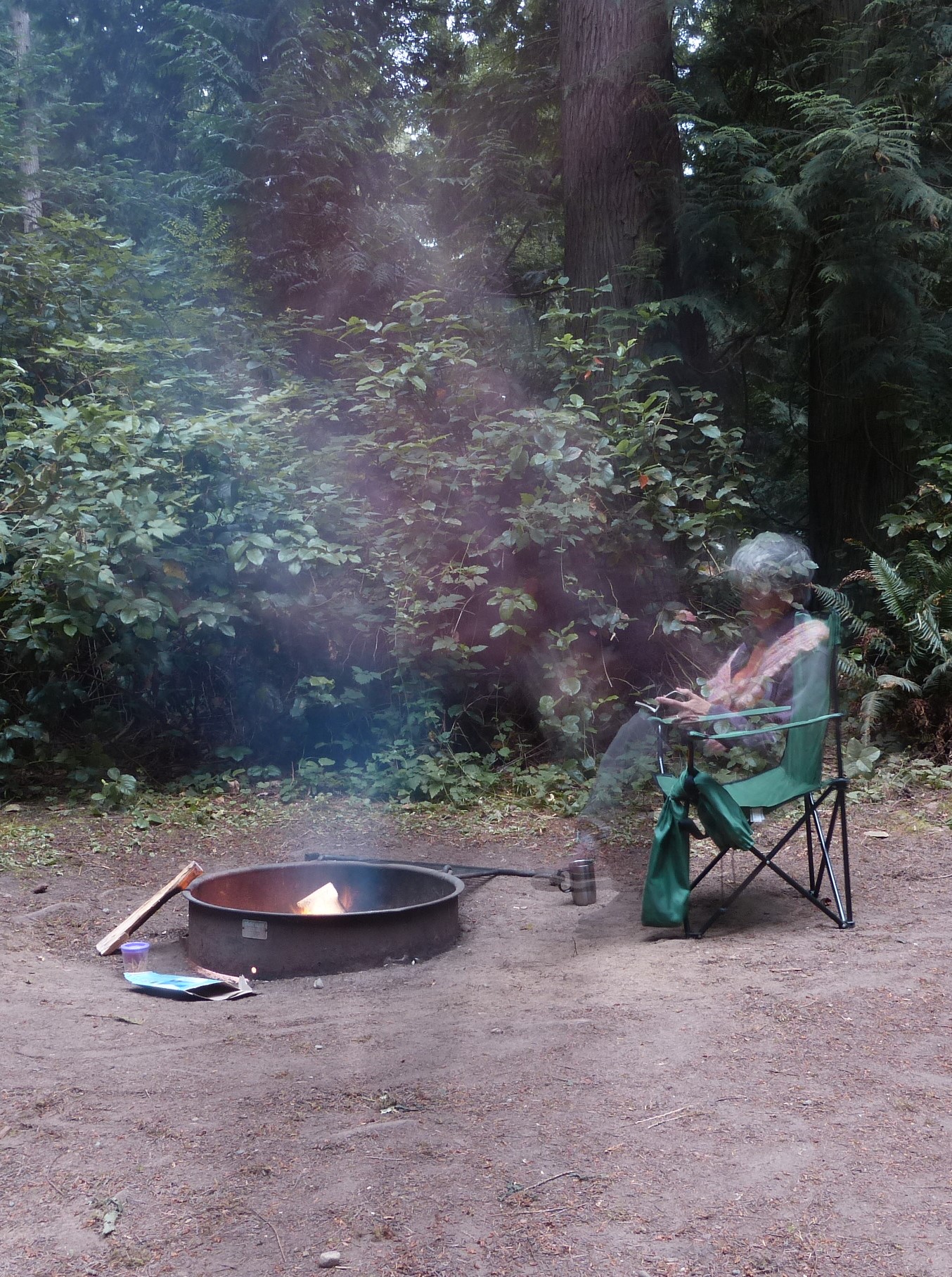 She is disappearing as she reads. Why? What is the book? Is it the fire? The campsite? The woodsmoke? Something in the wood itself?